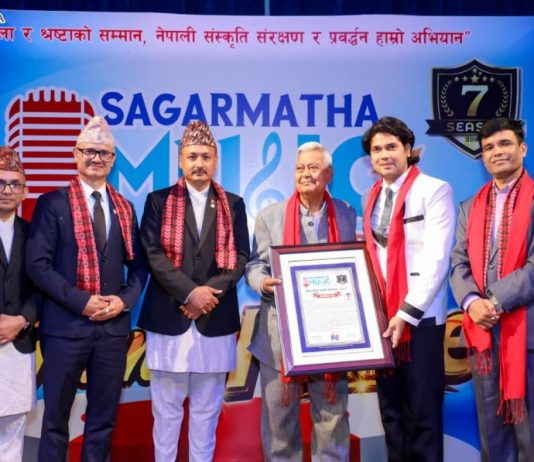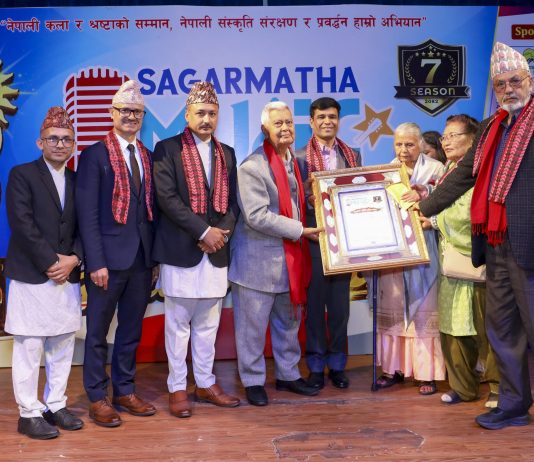 With the slogan “Honoring Nepali art, talent to promote and preserve Nepali Culture,” the 7th edition of the Sagarmatha Music Award 2082, recently held in Kathmandu, honored fashion and pageant choreographer Aswini Kant Jha with the “Sagarmatha Art Honor 2082.”
